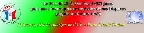 Pour la troisième année, ce 30 Aout 2015 à 11h, devant la bien nommée Stèle des Martyrs de l’Algérie Française, nous serons présents, pour donner un sens à cette Journée Mondiale Des Disparus. Nous qui ne sommes invités nulle part, dont nos victimes et disparus ne figurent même pas dans les consciences de ceux qui les ont abandonnés, qui ont caché et enfin nié leur existence, nous rendrons hommage à tous ceux qui se croyaient en sécurité derrière un inexistant « Cessez le feu », et un flamboyant accord d’Evian, dont les seuls effets visibles seront les massacres et enlèvements du 5 juillet à Oran, et le départ forcé d’un million de personnes déplacées.