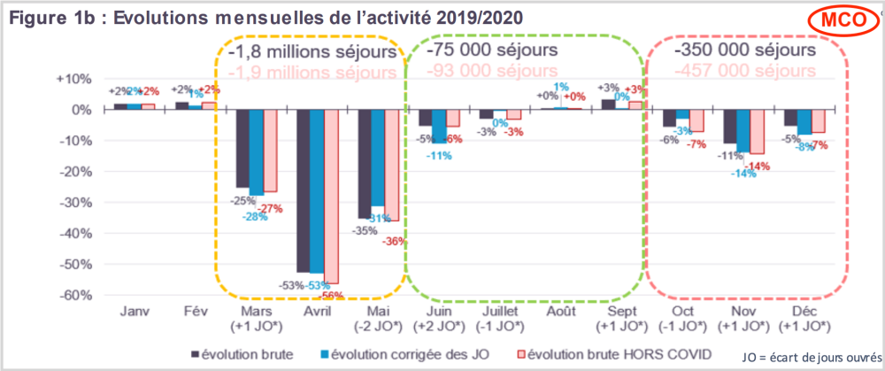 Mieux, si l’on se livre à une analyse mensuelle du nombre de séjours comme le fait l’ATIH dans le schéma ci-dessous, on constate que le recul est particulièrement marqué lors des fameux pics covid d’avril et novembre 2020 :