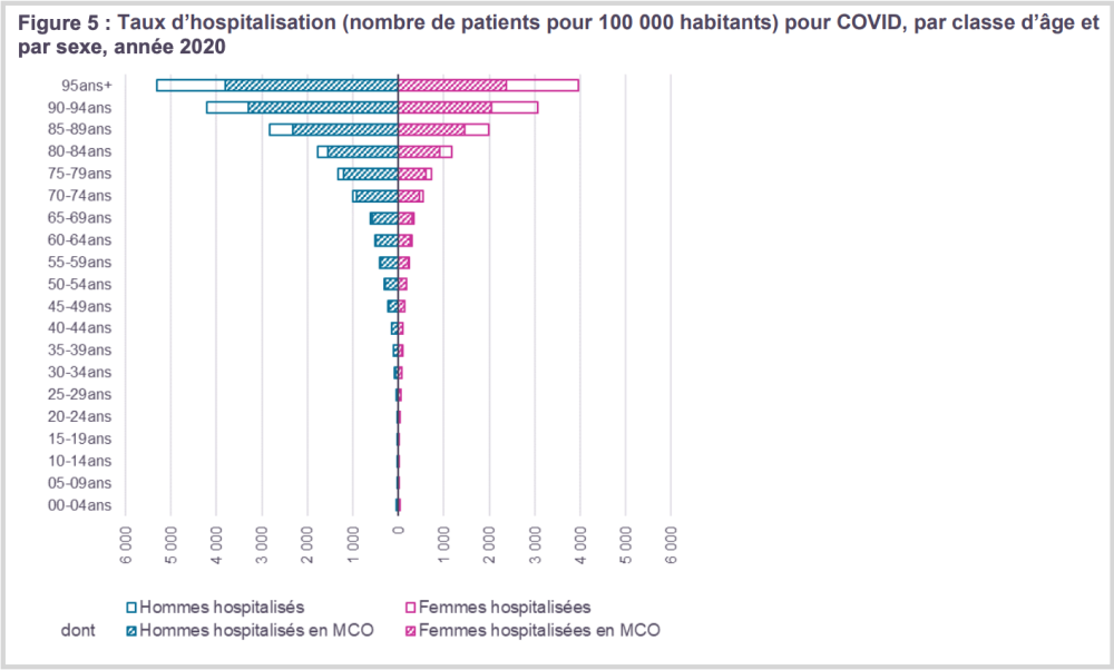 Au total, 218 000 patients ont été hospitalisés pour Covid-19 en 2020 pour une durée moyenne de 18 jours, dont 186 000 (85 %) en MCO ou hospitalisation « classique » pour une durée moyenne de 13 jours.
