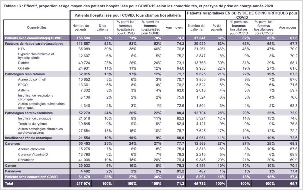 En 2020, 72 % des patients hospitalisés pour covid présentaient de telles comorbidités, les facteurs de risque cardio-vasculaires (hypertension artérielle, cholestérol, diabète, obésité) comptant à eux seuls pour 52 % des hospitalisés :