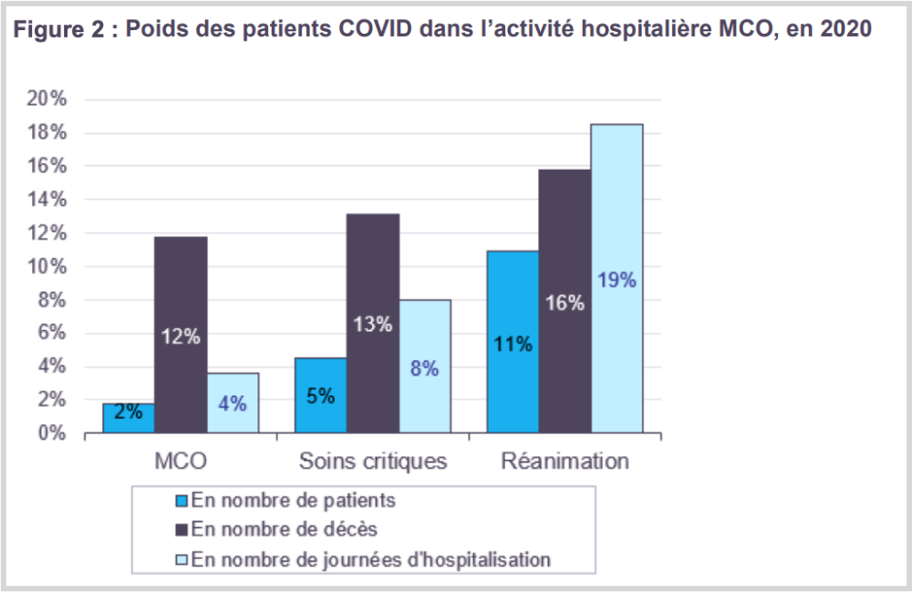 « Les patients covid représentent 2 % de l’ensemble des patients hospitalisés au cours de l’année 2020, tous champs hospitaliers confondus (Figure 1). »