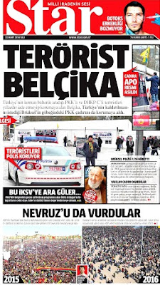 Le journal Star, sous le contrôle absolu d’Erdogan, a publié le 22 mars 2016, jour des attentats à Bruxelles, à la une en gros titre : « Belgique, État terroriste », en accompagnant la photo de Kurdes brandissant des drapeaux du Rojava, qui est le nom de l’État autonome kurde, fondé en Syrie du Nord, ce qui constitue une menace directe contre la Turquie. Dans le même numéro du journal, il y avait des menaces proférées par Erdogan contre la Belgique, et il y avait bien sûr de nombreux articles en rapport dans le journal.