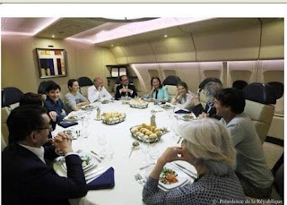 (photo ci-dessous : au fond de l’image, dans la salle à manger de l’avion présidentiel, en bleu ciel, Ségolène à la gauche de Président)