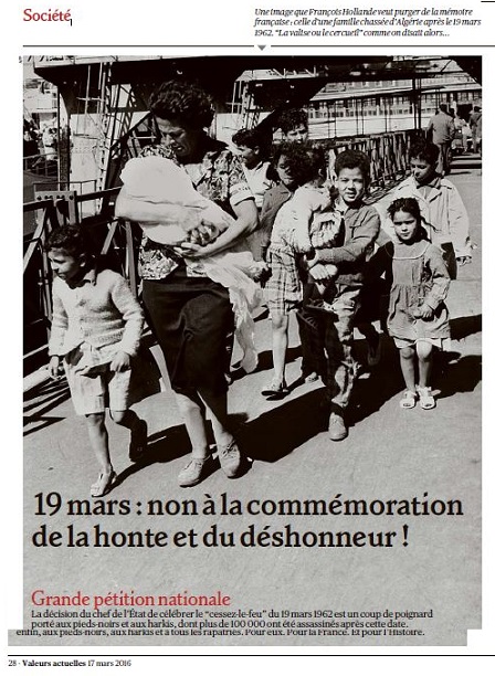 Enfin, en commémorant l e 19 mars 1962, François Hollande, en plus de jeter le voile noir de l’oubli sur les souffrances d’une partie de ses compatriotes, poursuit sa démarche de repentance vis-à-vis de l’Algérie, qui célèbre le 19mars comme une victoire et exige que ne soit reconnue qu’une seule catégorie de victimes.