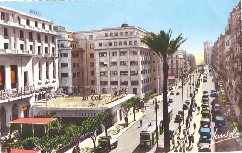 Venez, je vais vous montrer quelque chose : d’abord, on passe devant l’Hôtel Terminus, à peu près le seul endroit où on peut prendre un café et un croissant à 6 heures le matin à Alger, même le 1er janvier, je l’ai fait . Ensuite on traverse la rue Ledru-Rollin que au bout vous avez la Pharmacie Moralli que j’habitais en face et que j’allais acheter mes médicaments et que la jeune pharmacienne elle était belle comme un astre (quand j’étais au Lycée, d’accord ça date, mais pas assez pour que je l’oublie, pas assez pour que je me sens vieux), ensuite la rue Colbert, et enfin la rue de Strasbourg. Dans la rue de Strasbourg, il y a le bureau de poste où j’ai acheté tellement de timbres et où j’ai mis tellement de lettres à la boîte (j’ai toujours aimé écrire), des arbres splendides sur les trottoirs (platanes ou bellombras je me rappelle plus) ; et surtout, la rue de Strasbourg elle est coincée entre les deux immeubles de la Banque d’Algérie (Banque Centrale d’Algérie) et de l’Assemblée Algérienne, que c’est là que je voulais vous emmener depuis tout à l’heure.