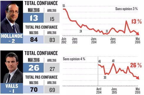 - Le Figaro, sur le même sujet, aujourd’hui, avec pour titre : " L’impossible remontée de Hollande dans les sondages ". Hollande continue de plonger :