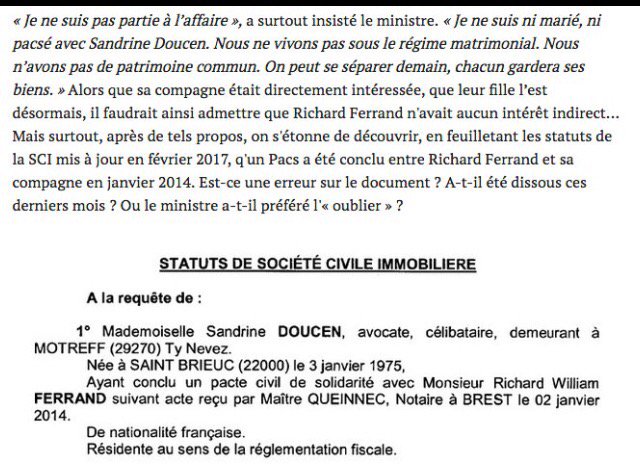 mais que Richard Ferrand puisse affirmer haut et fort qu’il n’est ni marié, ni pacsé avec sa compagne, ça franchement, c’est à la fois pas cool pour elle, ils sont pacsés depuis 2014, un magnifique mensonge et nous prendre pour des cons !