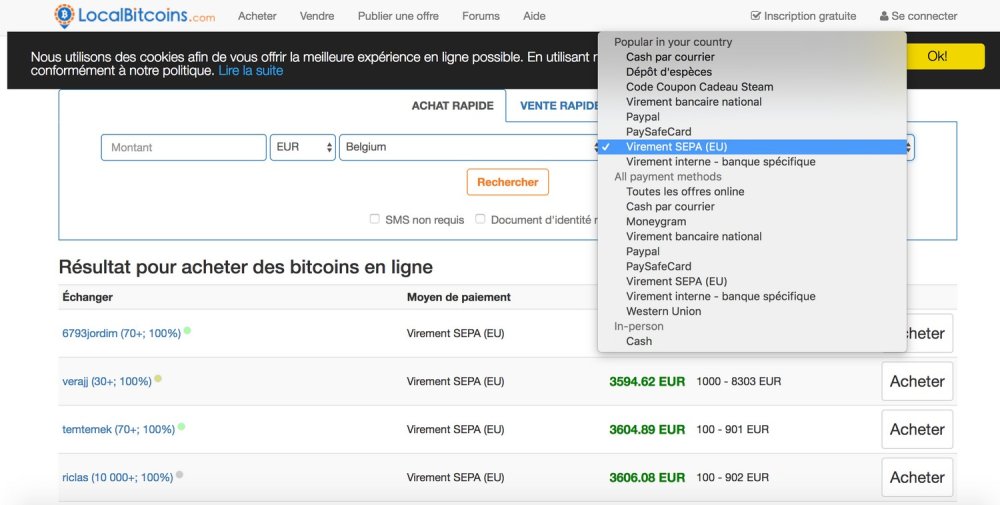 Il ne faut pas s’arrêter au terme « local » ; ici, vous pouvez tout à fait acquérir des bitcoins d’un correspondant (par exemple espagnol) s’il a un compte bancaire dans un pays SEPA. Pour ce faire, il vous suffit de choisir le mode de paiement adéquat (dans notre cas, un virement SEPA) :