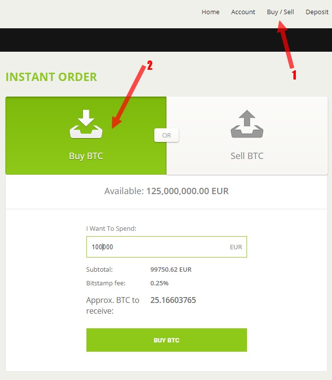 On aura d’abord cliqué sur (1) Buy / Sell pour se positionner sur la page d’achat/vente, puis on cliquera sur (2) Buy pour acheter quelques bitcoins. Cliquer sur le gros bouton vert citron en bas lancera l’ordre.