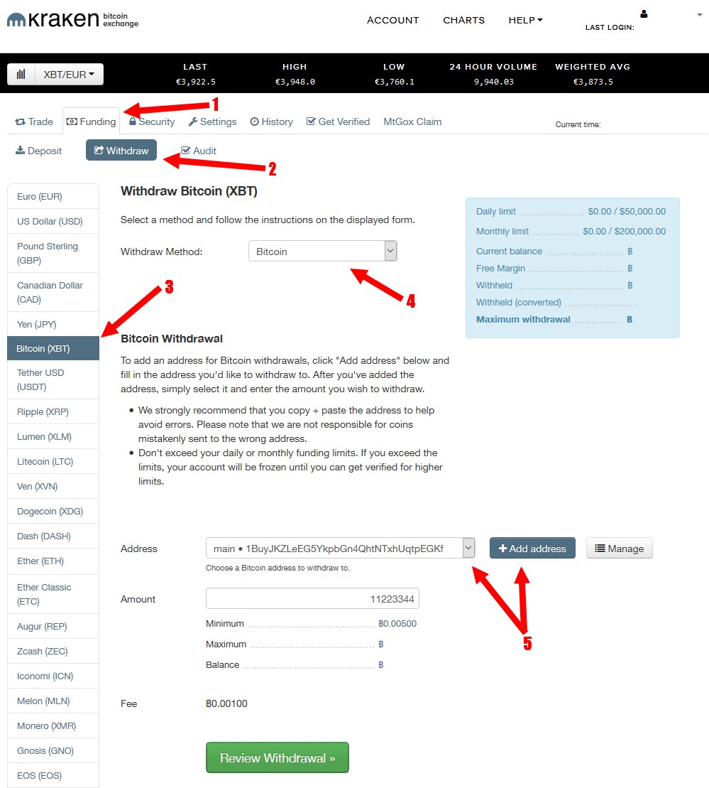Après avoir cliqué Funding (1), on choisira le retrait (withdraw, en (2)) puis Bitcoin (XBT) en (3). La méthode sera « Bitcoin », permettant un transfert vers votre portefeuille. Il vous faudra obtenir l’adresse de ce portefeuille (ce qui est expliqué plus loin). Pour la saisir, on emploiera le bouton +Add address (5). Il suffira ensuite de valider le nombre de bitcoins qu’on souhaite retirer et de valider avec le gros bouton vert.