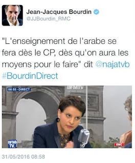 Deuxième temps forts, mais là, j’étais sous la douche, l’annonce, paraît-il d’une volonté belkasénienne d’enseigner l’arabe, dès le CP ! Enfin, heureusement que Bourdin a twitté le truc, sinon je serais passé à côté. Mais curieusement, il a twitté l’info deux fois à quelques heures d’intervalle et pas de la même façon :