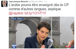Deuxième temps forts, mais là, j’étais sous la douche, l’annonce, paraît-il d’une volonté belkasénienne d’enseigner l’arabe, dès le CP ! Enfin, heureusement que Bourdin a twitté le truc, sinon je serais passé à côté. Mais curieusement, il a twitté l’info deux fois à quelques heures d’intervalle et pas de la même façon :