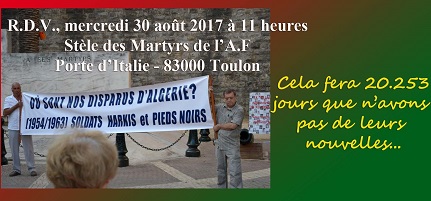 Pour la cinquième année, ce 30 Aout 2017 à 11h, devant la bien nommée Stèle des Martyrs de l’Algérie Française, nous serons présents, pour donner un sens à cette Journée Mondiale Des Disparus. Nous qui ne sommes invités nulle part, dont nos victimes et disparus ne figurent même pas dans les consciences de ceux qui les ont abandonnés, qui ont caché et enfin nié leur existence, nous rendrons hommage à tous ceux qui se croyaient en sécurité derrière un inexistant « Cessez le feu », et un flamboyant accord d’Evian, dont les seuls effets visibles seront les massacres et enlèvements du 5 juillet à Oran, et le départ forcé d’un million de personnes déplacées.